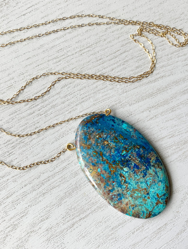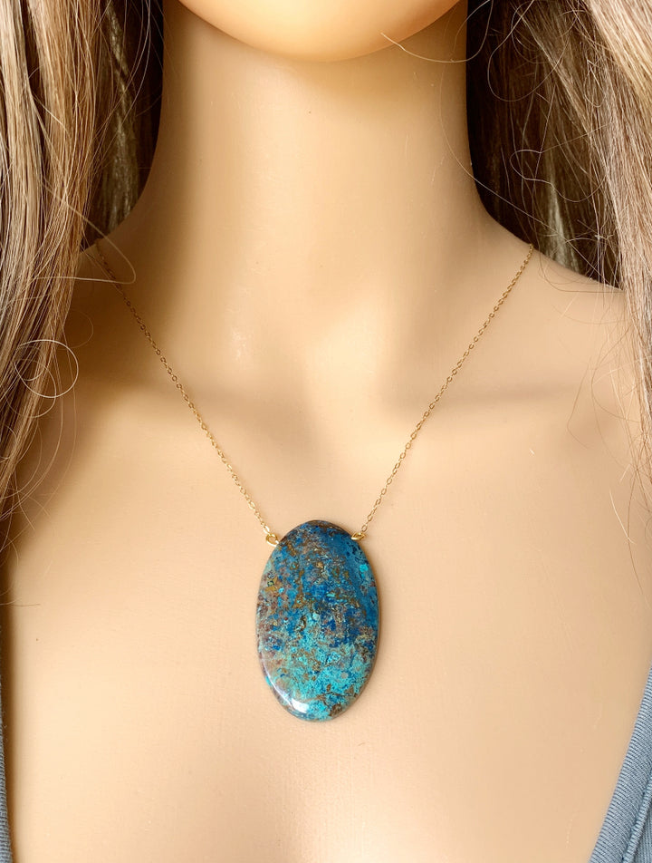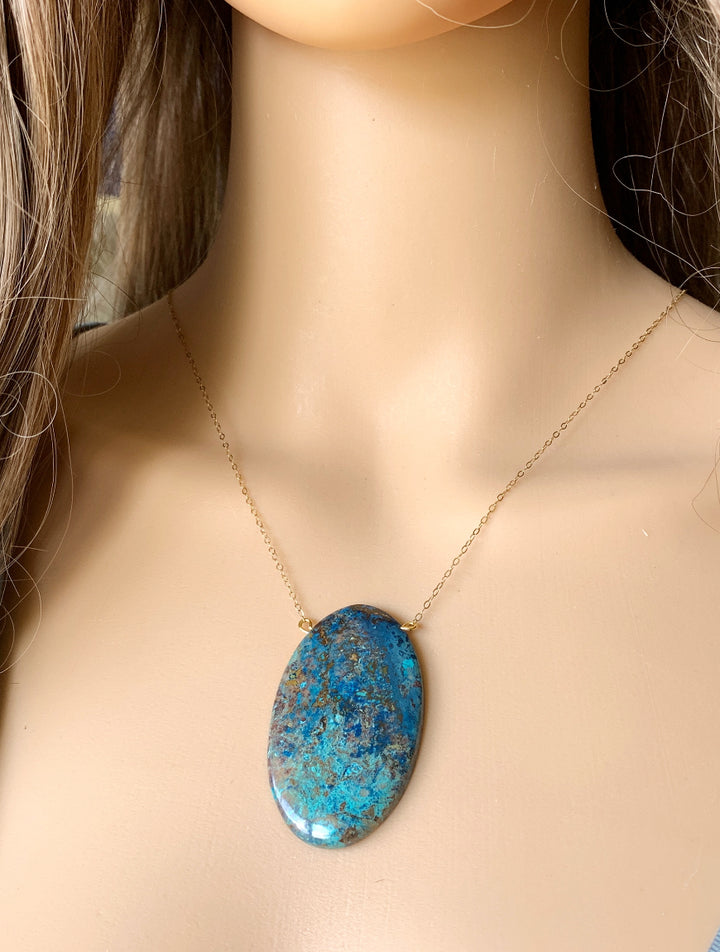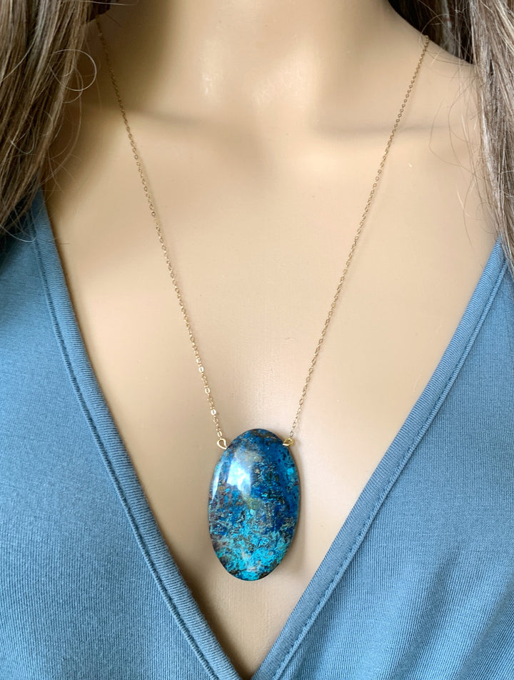 One of a kind large polished Azurite crystal measuring 50mm x 38mm will be handcrafted into a gorgeous necklace in quality 14k Gold Fill, Sterling Silver or Rose Gold fill chain in the length of your choice!