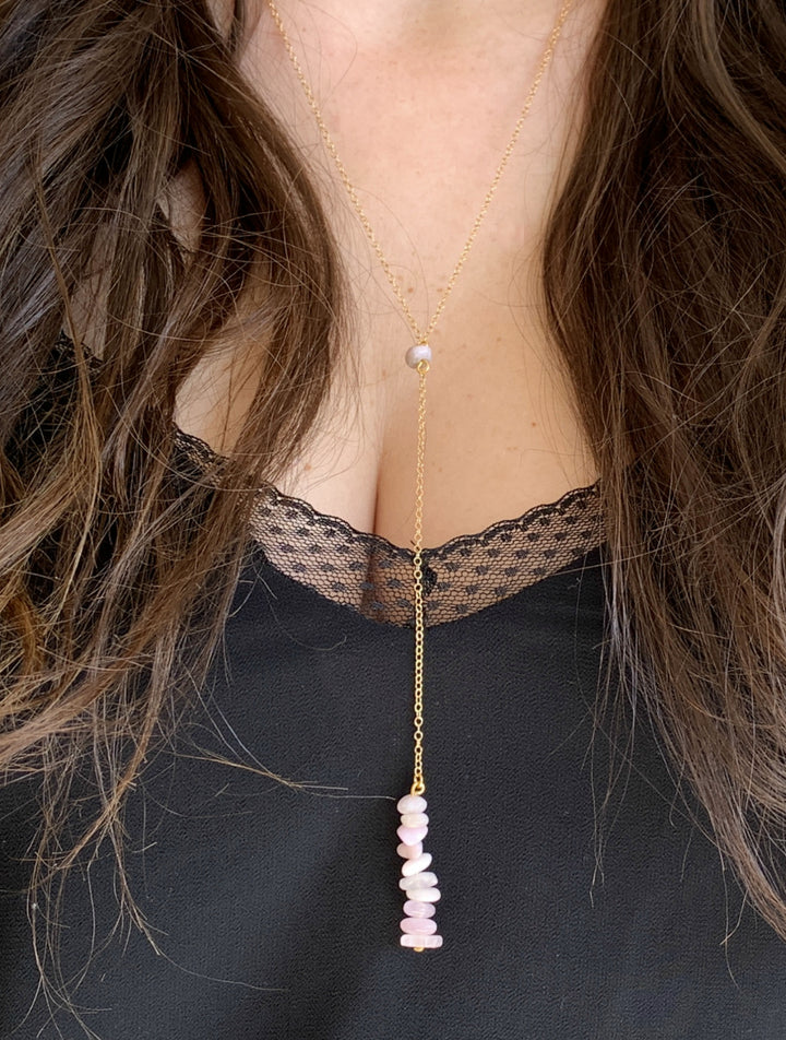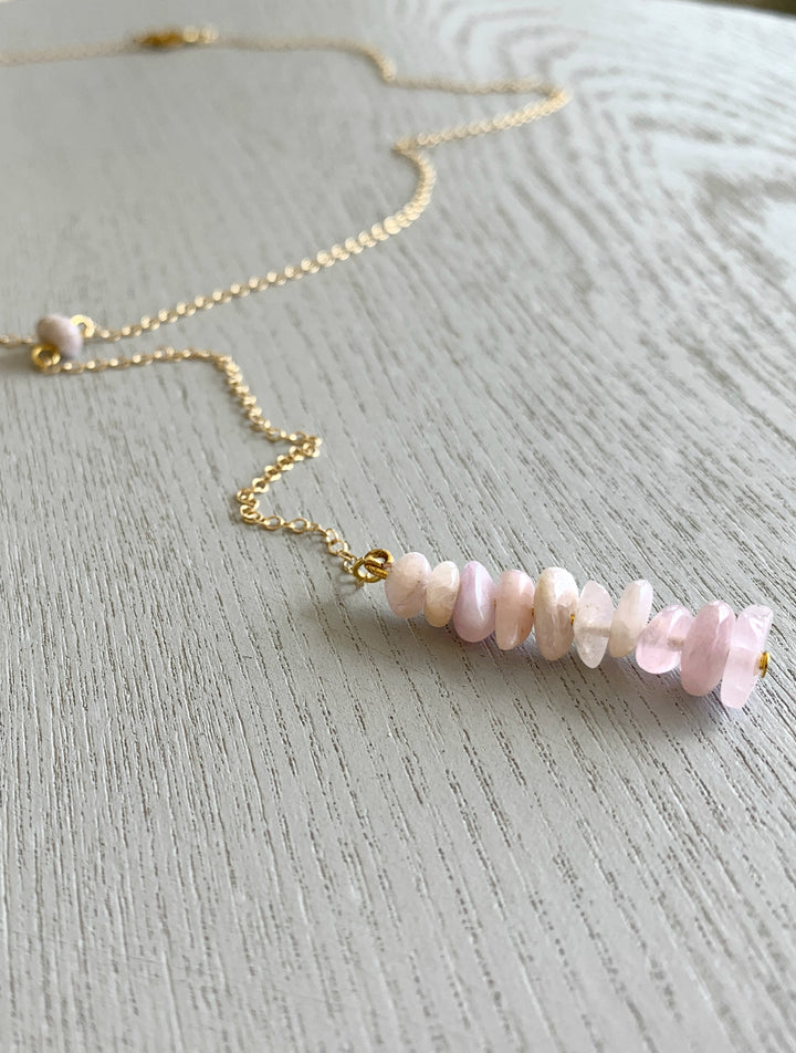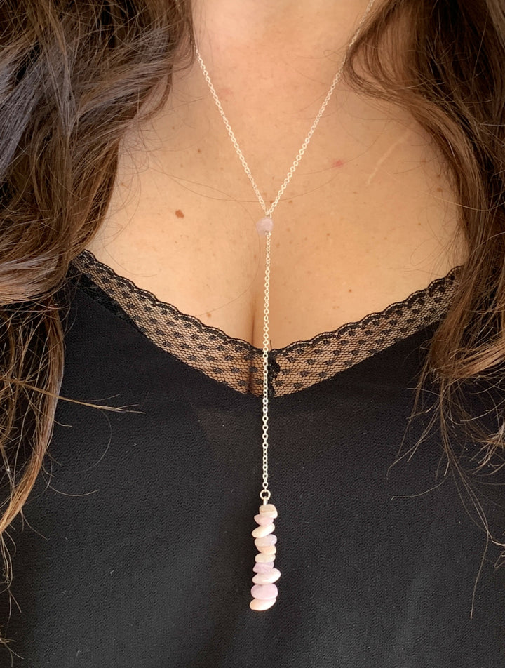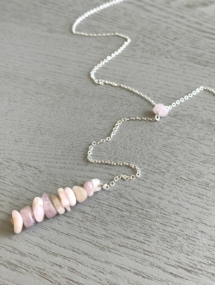 Kunzite crystal lariat necklace features beautiful raw pink Kunzite stones that hang approx 24 inch long on a Sterling Silver, 14k Gold Fill or Rose Gold Fill chain.